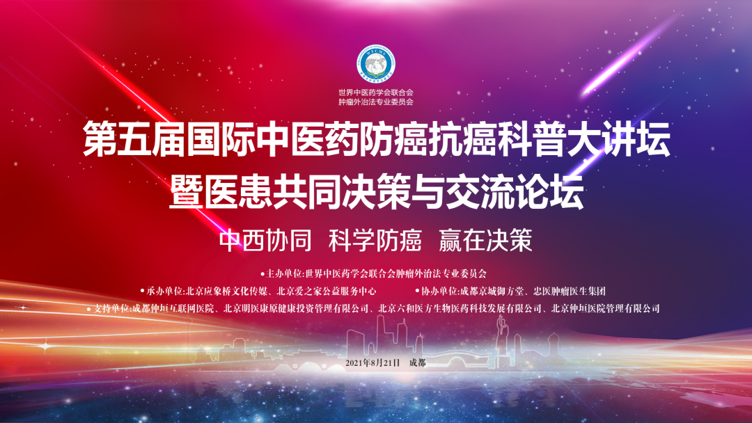 为普及科学防癌理念,建立健康生活方式,让科学防癌理念关口前移,多学科综合协同,中西医携手抗癌,让更多的患者和家属真正参与到癌症防治中来,推动医患共同决策,发挥中医药在防癌抗癌中的作用,由世界中医药学会联合会肿瘤外治法专业委员会主办,北京应象桥文化传媒、北京爱之家公益服务中心共同承办的“第五届国际中医药防癌抗癌科普大讲坛暨医患共同决策与交流论坛”将于2021 年 8 月 21 日在成都索菲特大酒店隆重召开。为大家传递最新的抗癌防癌科普知识,倡导最健康的防癌生活方式,为癌症患者和家属答疑解惑。